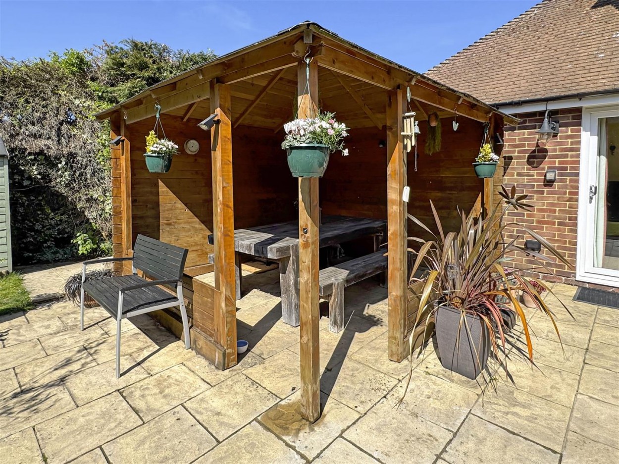 Externally to the rear there is a private and secluded SOUTH facing garden, which is surrounded and screened by mature trees, shrubs and flower borders with the remainder being mainly laid to lawn. The rear garden benefits from a large patio area with a feature fixed timber framed gazebo to one side, which is ideal for entertaining/alfresco dining. The gardens surround the property to all sides, where there is a shingled area with a shed which again is screened by trees, shrubs and bushes.