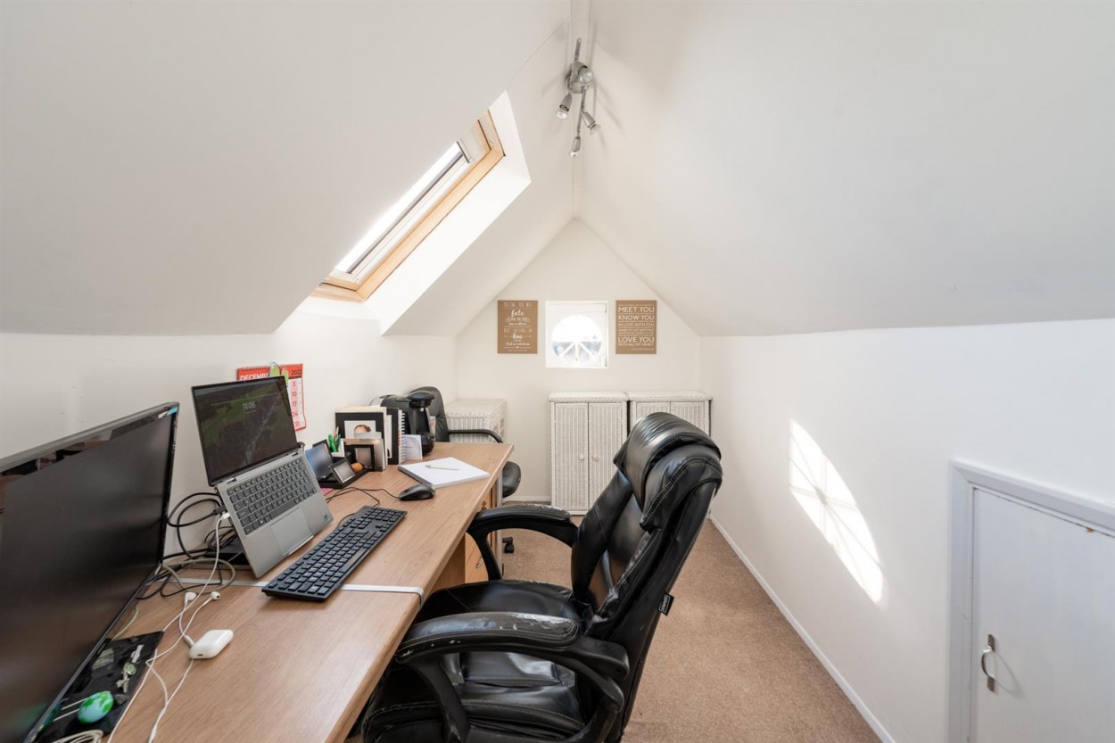 Outside there is a good-sized rear garden which is mainly laid to lawn. There are raised flower beds to the sides and rear and a patio area adjacent to the property. To the front there is a further enclosed garden with a driveway to the side providing off road parking which leads up to an attached tandem length garage (the garage is currently divided by a stud wall to provide an insulated gym area, and can easily be reverted back if desired). The garage also has access into the rear garden.